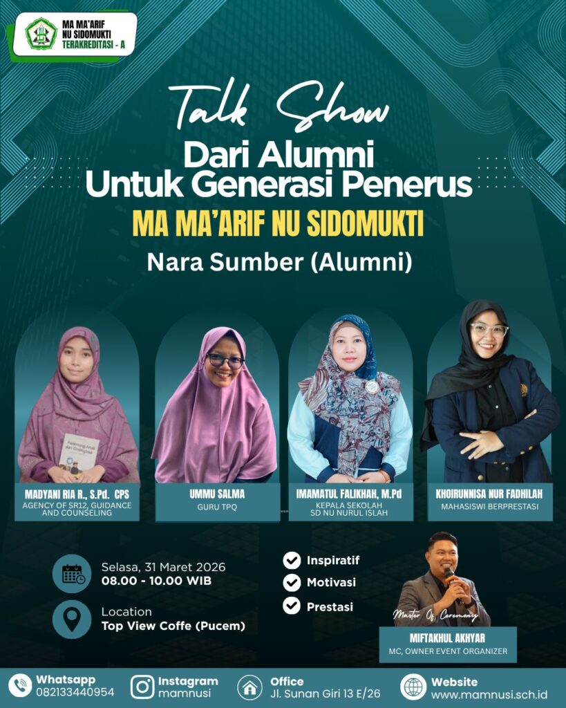 Mamnusi – Suasana berbeda tampak dalam kegiatan outing class yang diselenggarakan oleh MA Ma’arif NU Sidomukti pada Selasa (31/3/2026). Bertempat di Top View Cafe kawasan Putri Cempo Gresik, kegiatan ini menghadirkan sejumlah narasumber inspiratif dari berbagai bidang untuk berbagi pengalaman kepada peserta didik dan dewan guru.